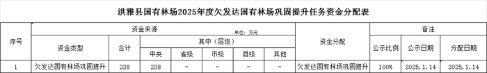 省财政厅、省林草局等部门《关于提前下达2025年中央和省级财政衔接推进乡村振兴补助资金预算的通知》(川财农〔202494号)下达洪雅县国有林场2025年欠发达国有林场巩固提升任务资金238万元。现将资金分配情况予以公告。